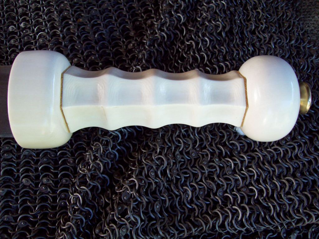 Respectfully I would like to share my first finished sword with you. It is a Newstead spatha with a mammoth ivory grip. The ivory grip was made by Monica Tielens of BikkelenBeen in the Netherlands. The blade is based on one found at Newstead (Scotland), the grip, a typical spatha grip with a small pommel, was found at Avenches.
