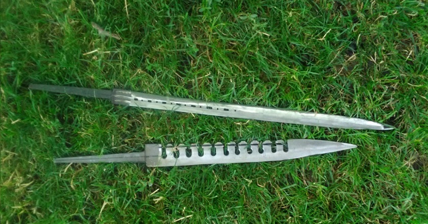 The longer one is 60 cm long, 2,5 cm wide and 6 mm thick, thinning to 3mm towards the point. It has a diamond cross-section. with central fuller, pierced with round and oblong holes. The blade has a reinforced point, but I might not keep it - I may grind it off. The blade represents a type of extremely long left-handed daggers from 16th/17th century. It´s nearly finished, just needs some cleaning of lines before it goes off to hardening & tempering.