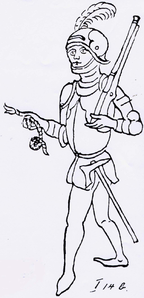 The serpentine itself held a smoldering piece of fungus while the gunners carried a length of very thick slow match around their arm or perhaps wound round their gun.