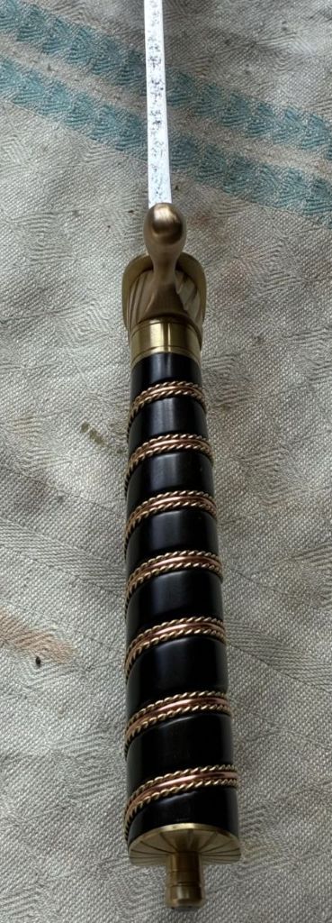 Handle is made of ebony wood. It is spirally wrapped with 3 strands of wire in a groove (single thick copper in the middle, two double twisted thin brass around it). See attached pictures for detail.