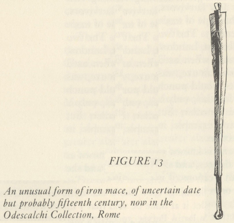 "There is in the Odescalci Collection in Rome a most interesting mace of aberrant form, like a rather graceful club forged in steel with a little finial at its head shaped as a truncated cone reversed, and a small spherical button at the end of the narrow, shaped grip, illustrated in figure 13. This is a rare example of such a mace, though several are to be seen in Italian paintings of the fourteenth century-notably a fresco by Giotto in the Cappella della Scrovegni, Padua (c. 1303-1305), and a predella by Giovanni di Bartolomeo Christiani (c. 1367-1393) in the Metropolitan Museum, New York. It seems to have been a type of weapon confined to Italy, used probably only during the fourteenth century, since no representations of it exist later than Christiani's predella."