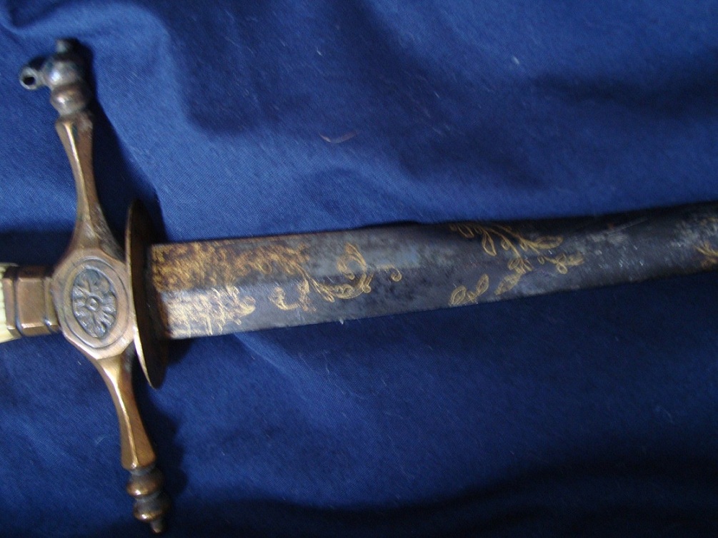 Your dirk also looks like there is some sort of panoply of drums or arms or instruments in gold. I am talking about the circular looking section of the gold washed etching. Hard to make out from the pic. Again a panoply design can help to date the blade.