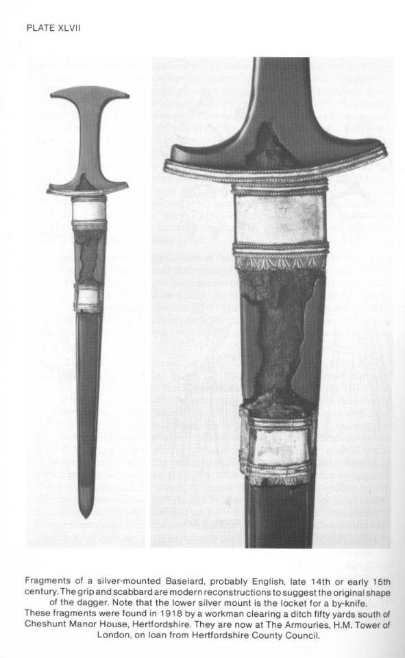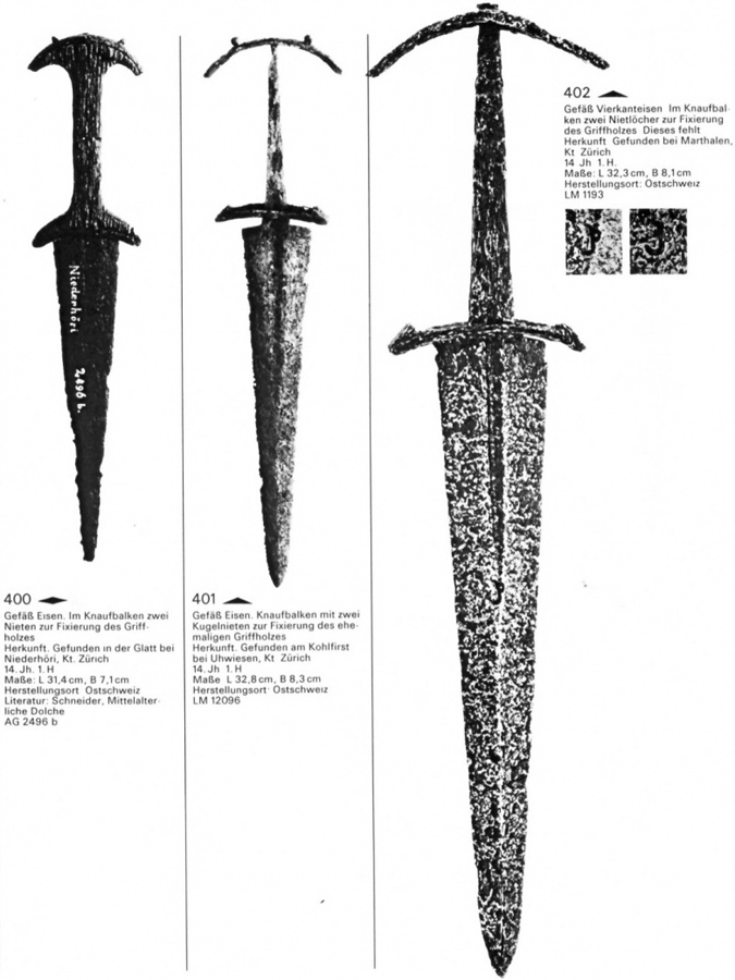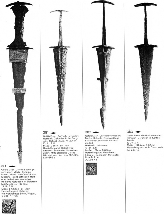 I'm looking to find more images of early baselards/Swiss daggers. For the sake of definition, here's what I mean: daggers of the 14th century (and beginning of the 15th) with a through tang (not scale), wooden grip (now often missing), and metal reinforcements to the wood grips. Many authors of English-language works simply call these early baselards. In Europe, they are often called Swiss daggers, even though that name is perhaps more applicable to later pieces. Nevertheless, I'm not looking for any debate on etymology or terminology.