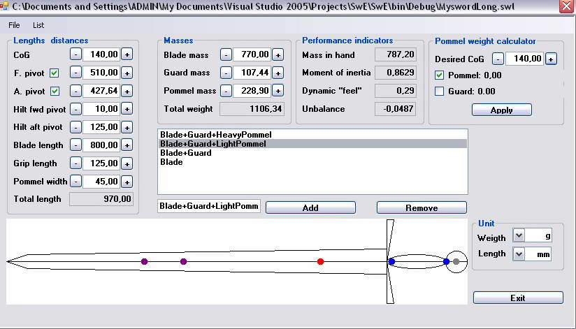 Following Vincent's instructions I wrote a little program to calculate some basic characteristics and determining pommel weight - CoG variations. I attached some screenshots with different setups.