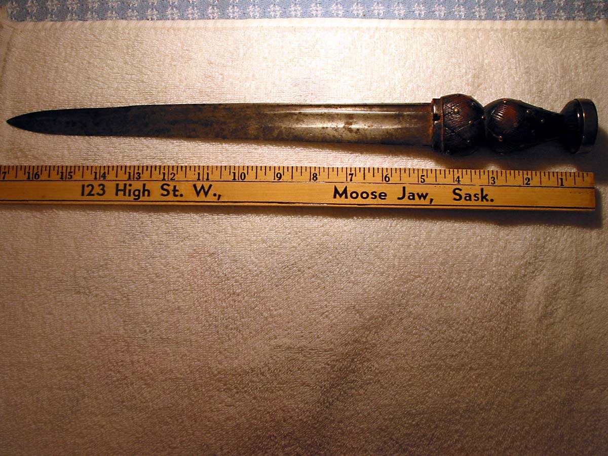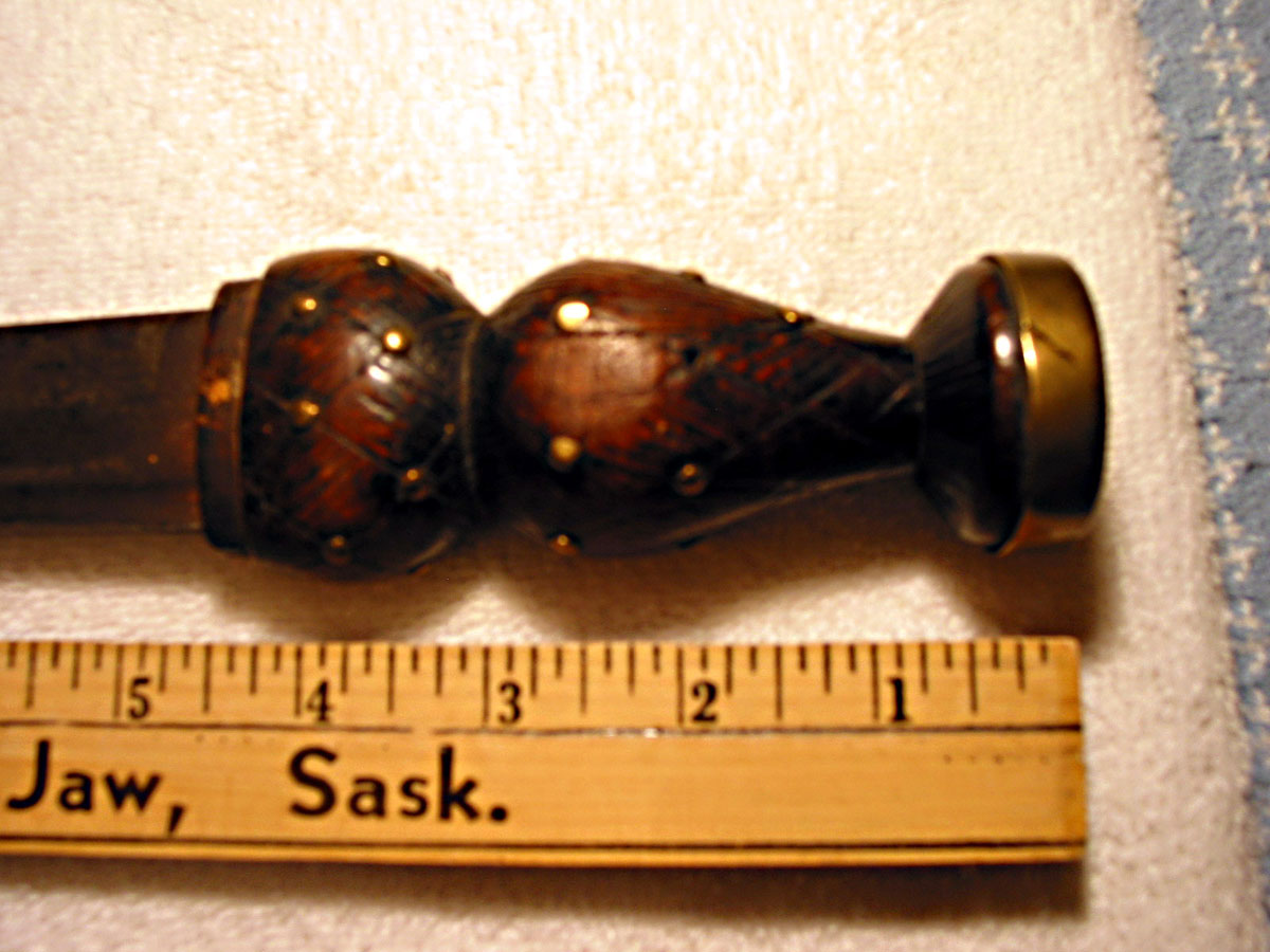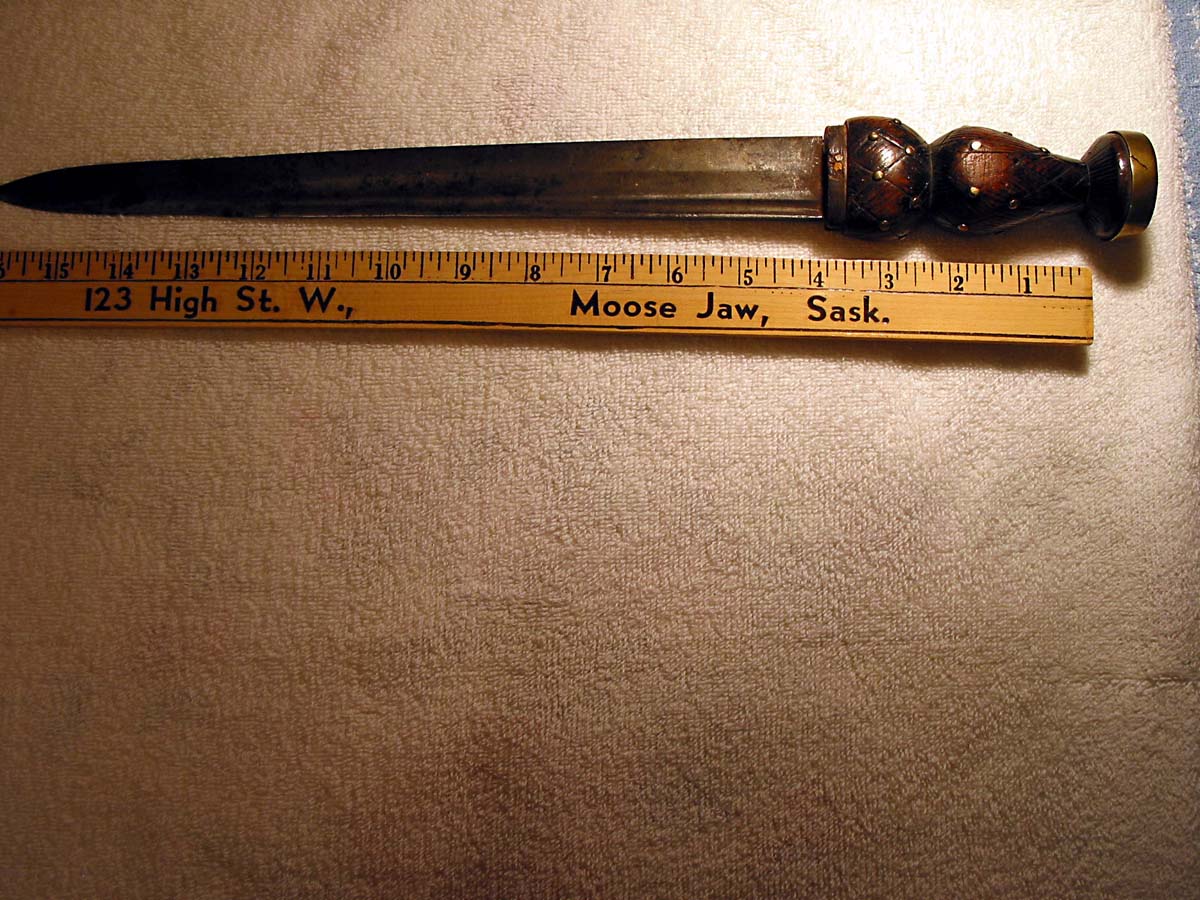 It is hard to be definitive from just the photos but it appears to be a 19th or early 20th c. regimental dirk. The basket weave pattern on the grips and the metal studs at the intersection of the patterns are a common feature of those knives as is the exaggerated shape. There was a metal fitting on the lower end of the grip, where it meets the blade, which is missing. Can you see any markings on the blade or elsewhere on the dirk? Is there a sheath?