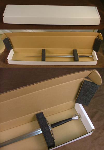 This sword came in Albion's new shipping box. The box is a significant improvement over the old one, which I really didn't think was inadequate. The ends of the box are quite a bit heavier and reinforced, and the box overall seems to be stronger. If the shipping gorillas smash this one enough to cause significant damage it will be largely moot, since any other packing would suffer the same fate. If a customer feels that the new packaging is still inadequate I would suggest paying the extra fee and have the sword sent in one of Albion's wooden boxes. Last year I had Albion ship my PJ back home in this fashion. Other than this special case I've never received a sword that was packaged better than this Sempach.