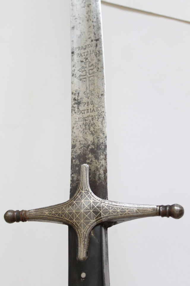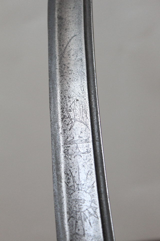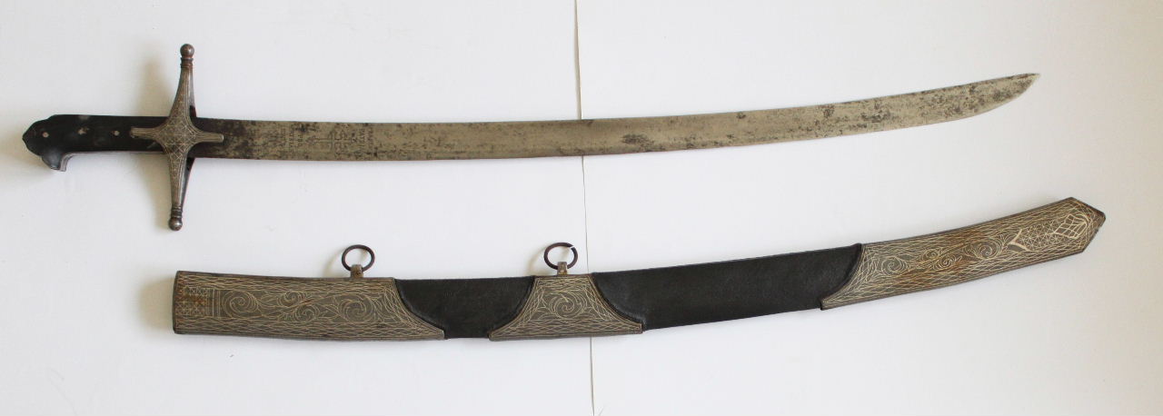 There are certain mismatches betweet the blade and the hilt. The blade is typical 18th century, the hilt is mid 17th century oriental style. The engavings on the blade suggest the 1848 revolution period. The fittings on the scabbard looks recent.