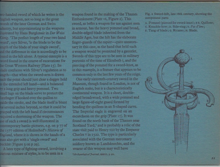 Here's the promised photos. They used this sword as a model to introduce hilt nomenclature, and so I've included the drawing of the hilt along with the photo. It show some details that aren't visible in the photograph.