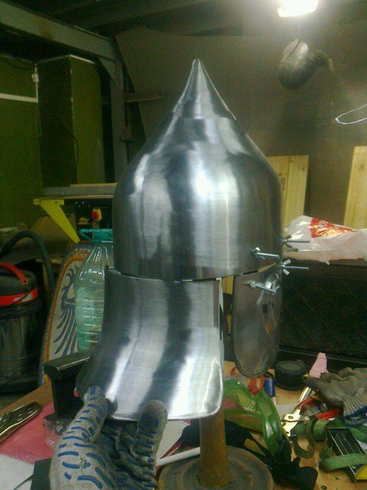 Hm, I have a 14 gauge helm that is mild steel. Pole axes are allowed in my group but I am not sure of the size or weight restrictions on them. It is a sugar loaf type and there parts at the top where there are two layered plates of 16 gauge resting on top of one another. It can dent with a hard enough blow. Where in all the lands can you get a hardened helm? That has to be serious money and seriously life saving : :surprised: My group does not require spring steel or hardened steel for helms. Just 14 gauge steel.