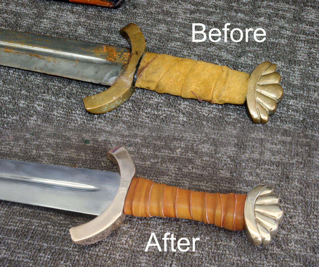 This is nothing to get excited about - it's a restoration of an old, cheap reproduction Viking sword that was made in India. But it came out rather nice, so I thought that I'd share. A friend of mine asked to see what I could do for this old, rusty, pitted sword. I didn't want to spend a lot of time working on it, but I wanted to give back to my friend something that he would like. Before and after pictures are shown below.