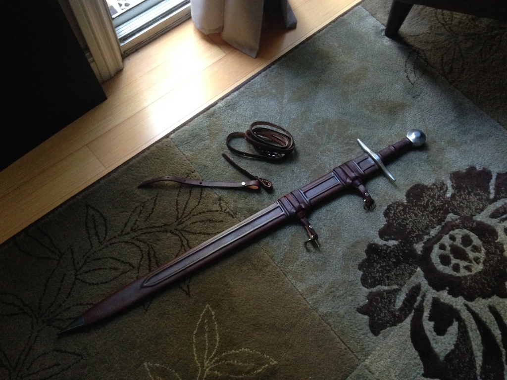 Asking $650 shipped. Scabbard made by Crusader Monk. Fits the sword perfectly, will not fall out. Comes with a belt and suspension system.