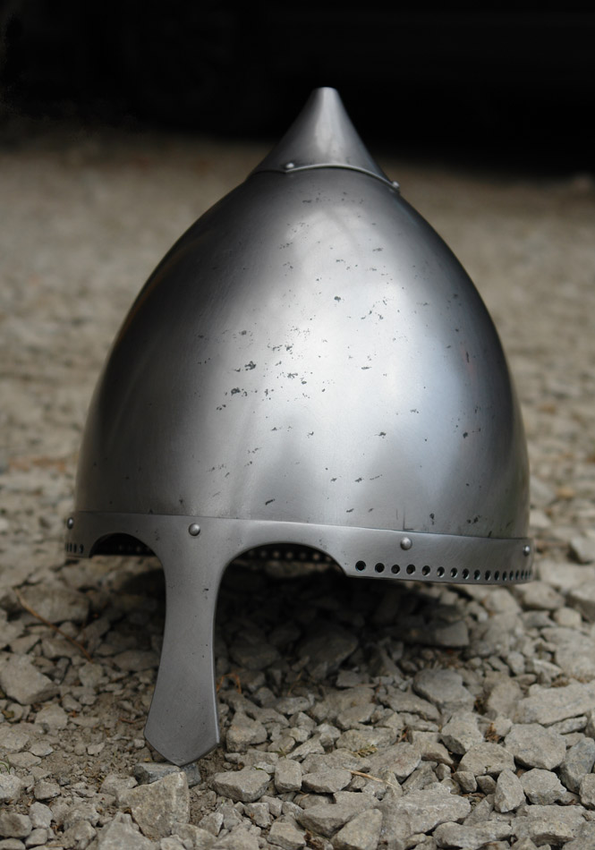 It's very popular shape ,knows from islamic miniatures. Oryginal helmet was also raised in single piece ...so, it's possible that it could be made in Near East or Byzantium.