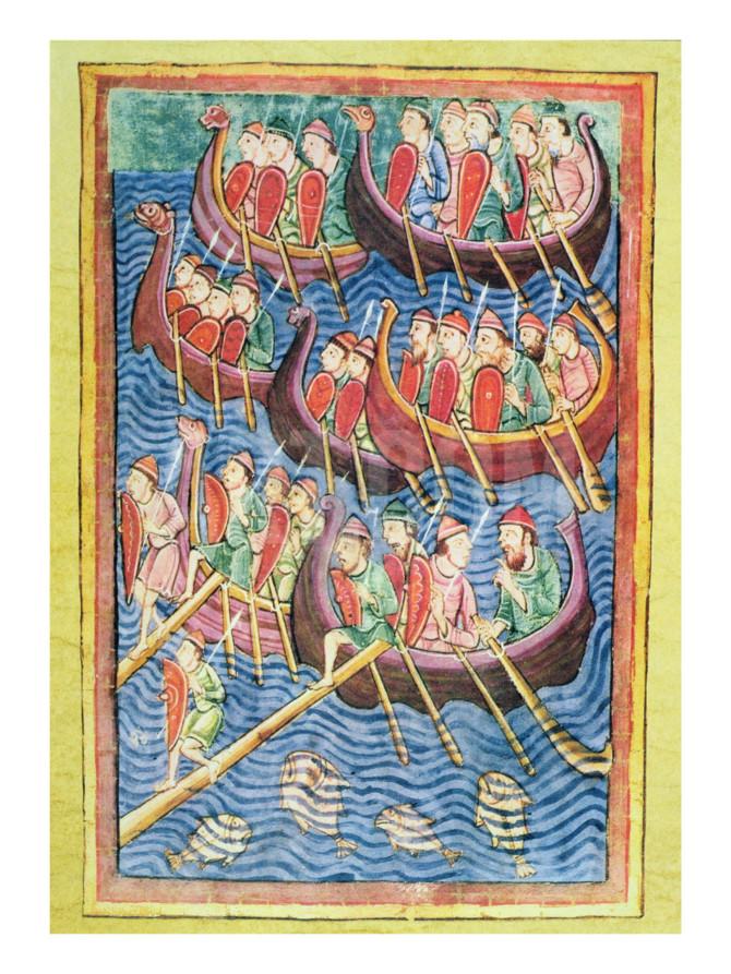Does anyone know the origin or have any accurate information about this image? Supposedly, it's a depiction of 'vikings' disembarking to England, and it's attributed to the 10th century, and it is stored in the Bymuseum in Oslo. I find it interesting that it is supposed to be depicting vikings, and is dated to the 10th century, while later or contemporary Ottonian, Italian and Anglo-Saxon images from the late 10th and early 11th centuries show round or domed shields in the majority, when shields are depicted. Some Ottonian and Byzantine manuscripts do show some smaller kite shields, but I would be interested to know if this manuscript is accurately dated, and where it is from or who is actually shown.