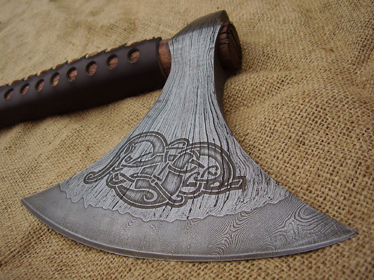 Wrought iron body with insertet high carbon damascus cutting edge.