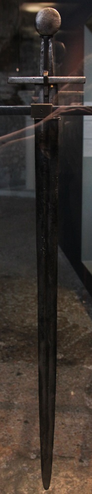 Here is another interesting one for discussion... It seems very large in many dimensions, almost 115 cm long and clearly longer originally. There is a fragment of surviving scabbard, and a complex inscription that includes recognizable words: mater or pater, and filius. It also includes the sequence "TMAT" (et mater?), which appears at the end of the inscription of the Soborg sword. The museum has it as 12th century.