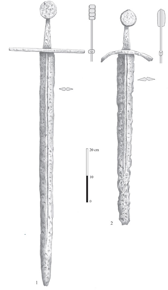 Marko Aleksić’s Mediaeval Swords from South Eastern Europe has a pair of swords, catalogue no.199 and 197 respectively, that he identifies as being Type Xa blades. However, assuming that his line drawings are accurate, the narrowness of the fullers means that both could just as easily be classified as Type XI blades. The sword on the right may actually have a Type H pommel rather than G, although the drawing seems slightly ambiguous.