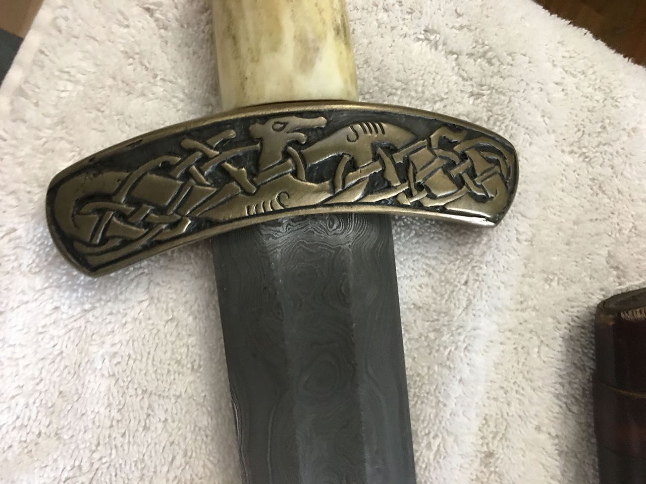 I am selling this sword . I had intended to be buried with it .The blade is by John Lundemo at Odinblades. The hilt,crosspiece,pommel,scabbard and hanging system are by Jaosh Davis at Davis Reproductions. The fittings on the sword and scabbard are bronze from waxes hand carved by Josh. The hilt is antler. The scabbard is wood core(poplar)covered with hand tooled leather.