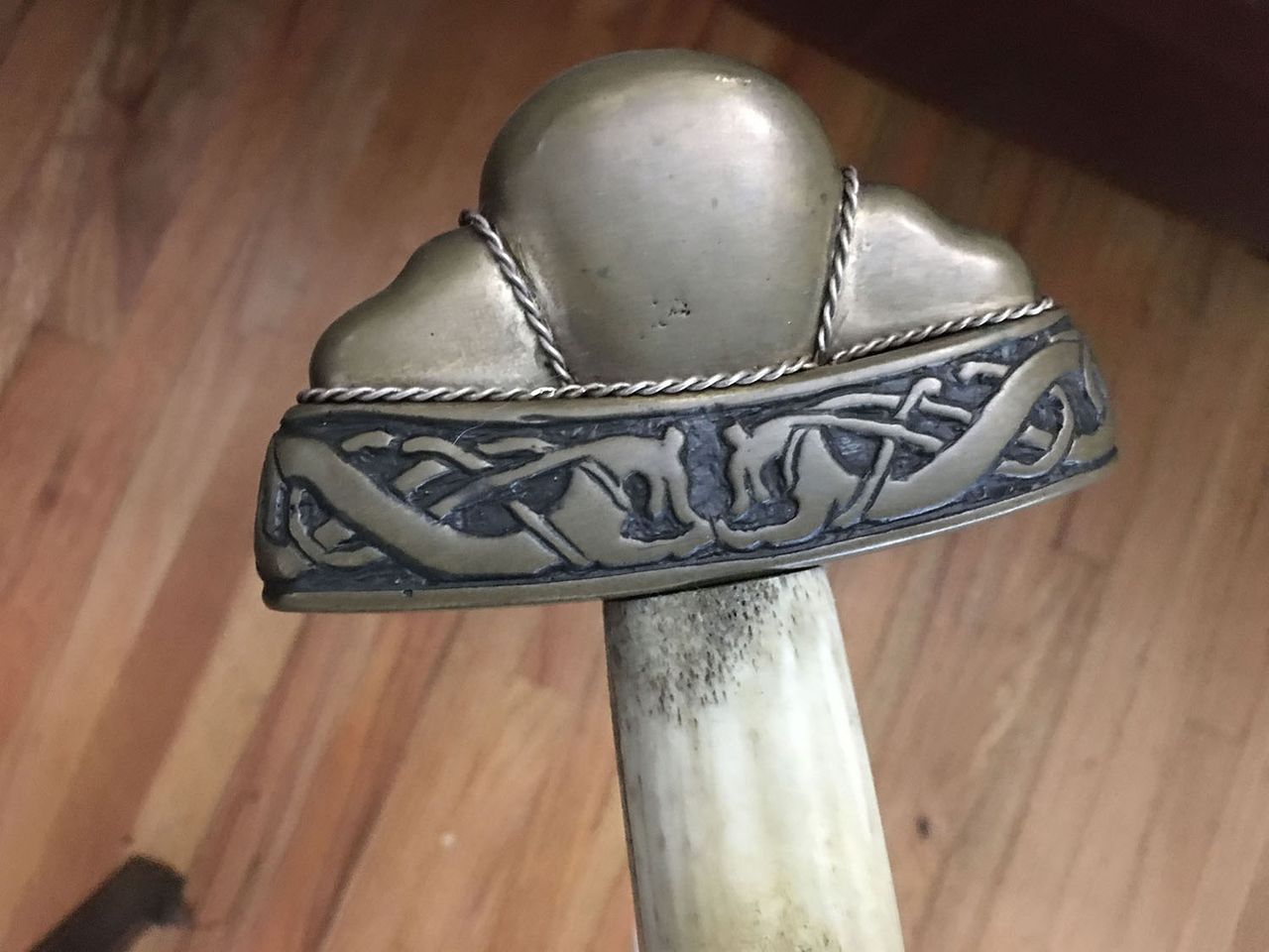 IThe blade is by John Lundemo at Odinblades. The hilt,crosspiece,pommel,scabbard and hanging system are by Josh Davis at Davis Reproductions. The fittings on the sword and scabbard are bronze from waxes hand carved by Josh. The hilt is antler. The scabbard is wood core(poplar)covered with hand tooled leather.
