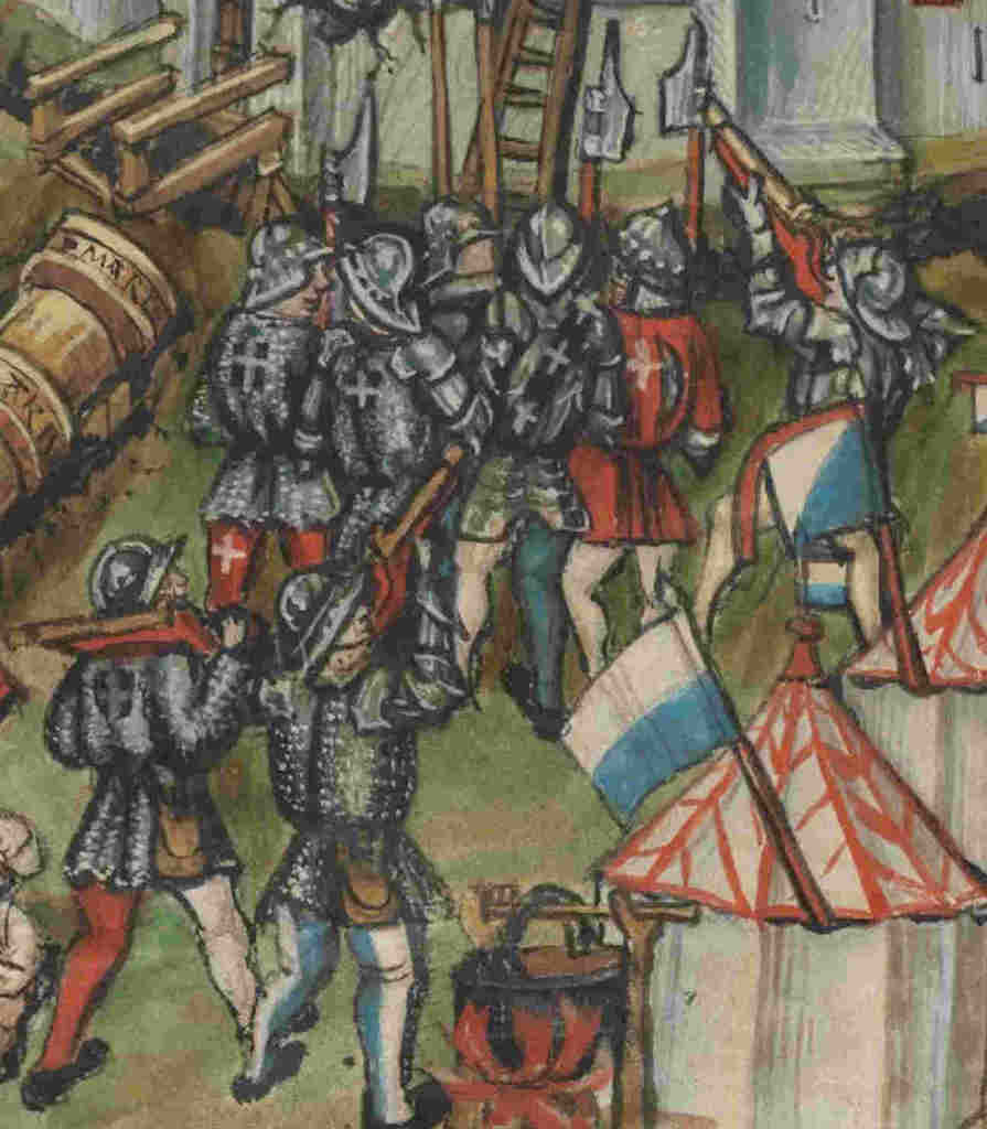 Add to that the fact that Fernão Lopes mentions the armor the squire Nuno Álvares Pereira was wearing during the coup in the Lisbon Palace: arm harness and plate cuisses, alonside a "belt-sword" (meaning an arming sword). Given the description, he was wearing normal garrison armor for his condition; nevertheless, though, the Queen bragged about the amout of arms he was wearing in the pallace (actually, he was intending to actually fight and depose her).