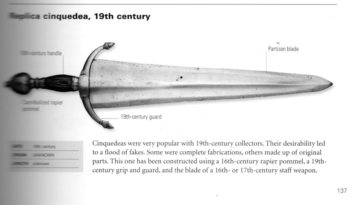 19th-century cinquedea from The Complete Illustrated History of Knives, Swords, Spears & Daggers. I imagine the reused parts make this one a lower-end repro/fake.