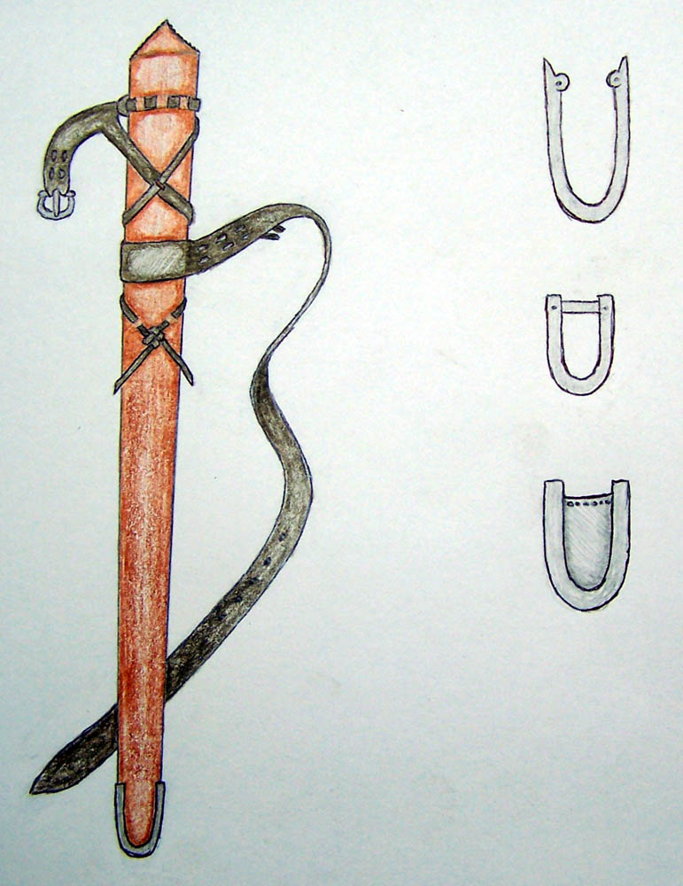 I'll be running a sale from now until July 15 on basic integral laced type scabbards. Each scabbard will sell for $600 plus shipping/handling. All scabbards will include: hand carved bass wood core, Hand-stitched and dyed leather cover and belts (your choice of colors), and hand-forged steel buckle and U chape. I've attached a crude sketch to demonstrate the lacing and a few chape variations. Please send all inquiries to elvenarts@hotmail.com.