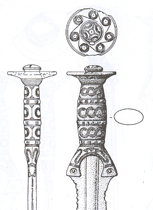 Second, the pommel on the Scottish dirk is radically different from the majority of ballock daggers and dudgeon daggers. The daggers might have a swell towards the pommel, or a "bump." But the dirk has a cap -- sticking out 360 degrees around -- that really effects the way you can hold the dirk. This seems like another fundamental feature of the dirk vs. other knives. Where did this come from? The closest thing I've seen to this handle shape is this celtic bronze sword (from this thread.)