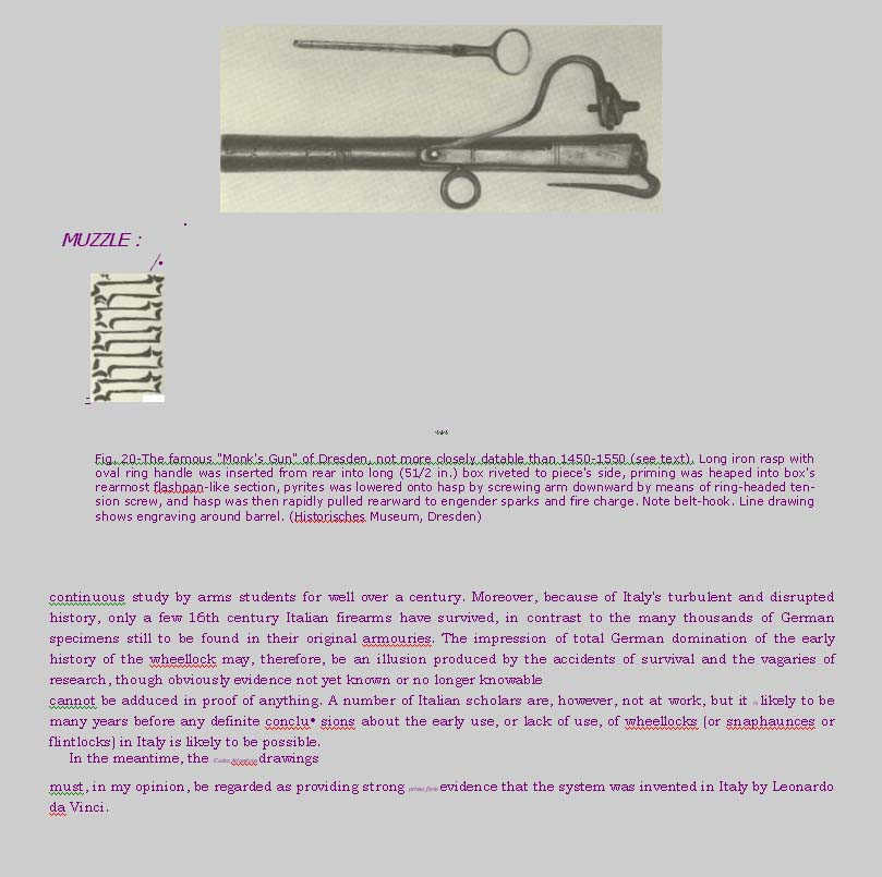 " Futher Notes on the Origins of the Wheellock " by Claude Blair there is this page or two on the "famous" Monk's Gun of Dresden dated approximately somewhere between 1450 and 1550. It is supposed to have been the brain-child of the monk Berthold Schwartz, the father of European gunpowder. The description of how this device operates leaves me more confused than when I first saw the photo of it.