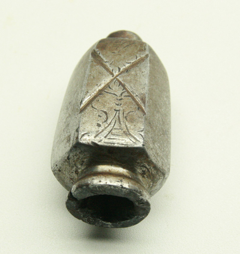 I'm no expert, but my opinion is that because it's flattened at the ends (squared), it places it later in the 16th century and into the early 17th century. I'd say 1590-1630. The more rounded/ bulbous examples are earlier, perhaps 1550-1630 or so.