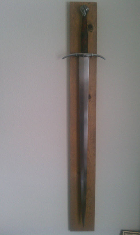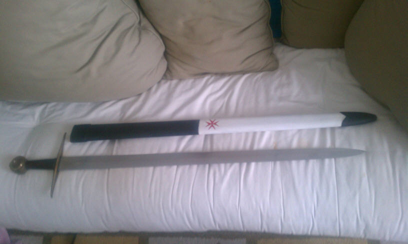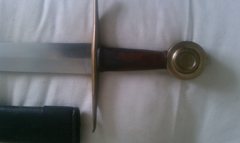 Have new ones coming, time to make room... ; ). Both of these have never been used; are onesy-twosey models/prototypes. Always oiled and never cut. As new. 500 for each. Free shipping by experienced sword-shipper. Money back guarantee, and insurance included. Both to these sell for 700.00 minimum + shipping, from AA. Please email any questions. BO considered if you want both together. Both of these were hand-picked by me right at the shoppe. The short(er) 1-hander has a custom made wood core linen wrapped and painted scabbard made by me for that blade, w/leather chape and top, lined w/green flannel. The scabbard is available for an extra 100.00 only.