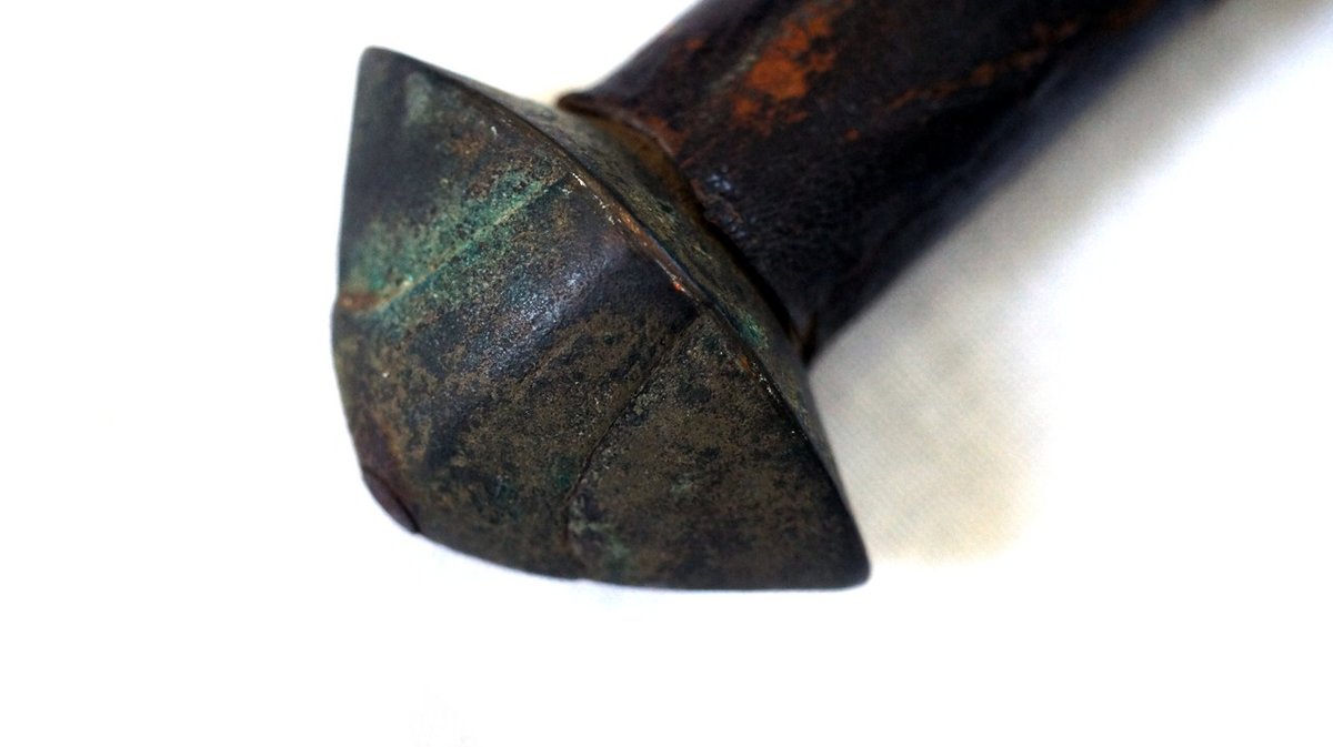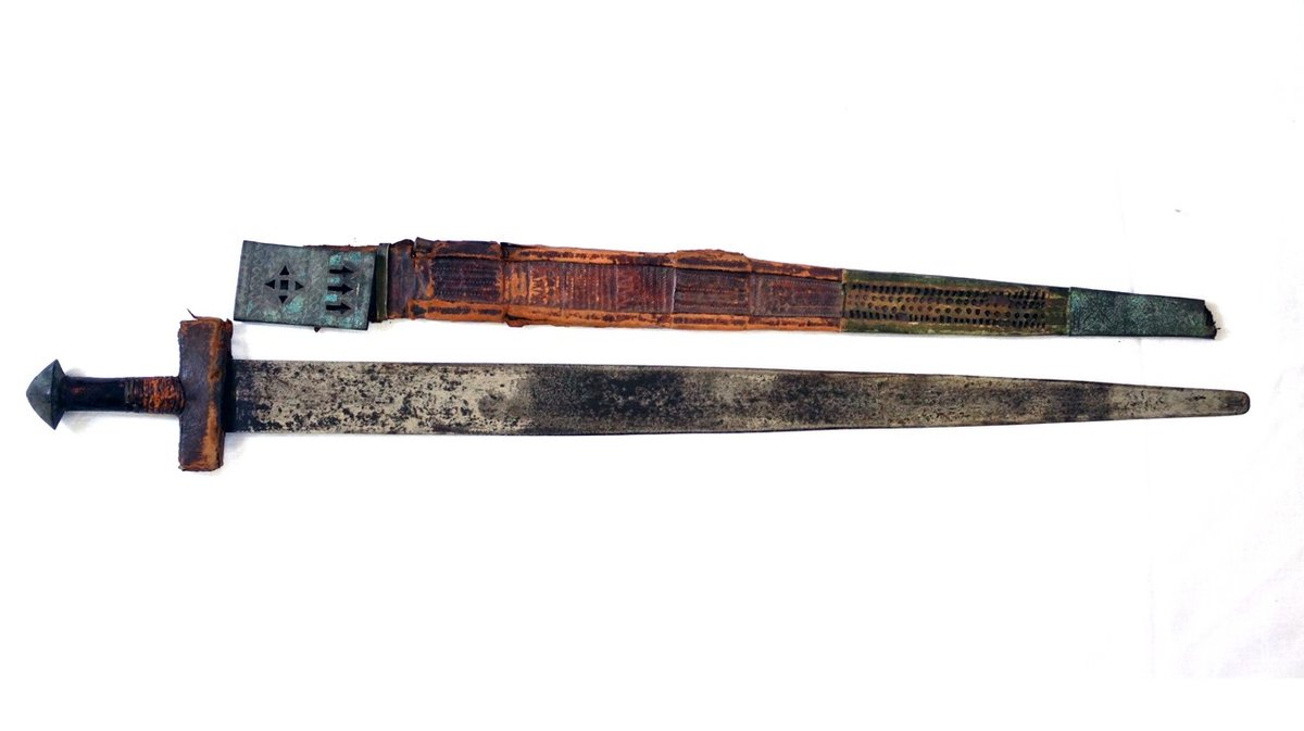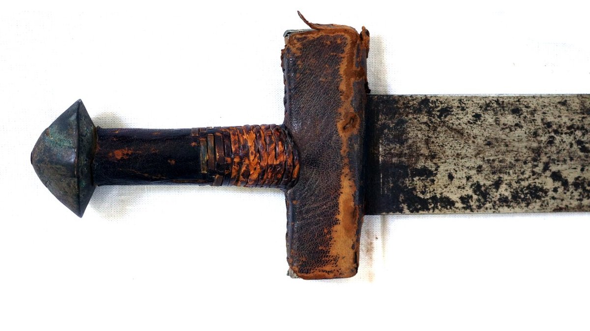 Flexible blade with some visible pitting. The scabbard has wear and tear and is not in perfect shape, wear particularly to top with losses to leather (typical for these swords and this age) and losses to tip. The metal throat is separated but the metal work intact.