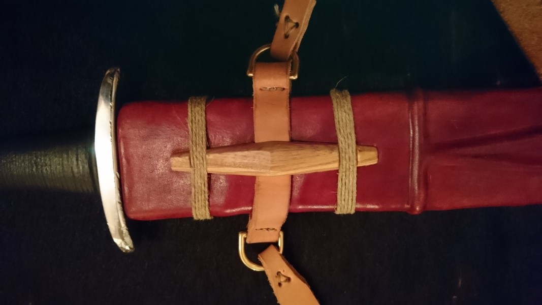 For sale is my viking sparring sword made by the polish swordsmith Wojcek. It is in a very good condition. No rust, no nicks in the blade, only a few at the crossguard. The scabbard is made out of a leather core, wrapped with linen an leather. It is not floppy at all, but as there is no wood in the constroction it is very unlikely that the sabbard would break in reenactment combat.