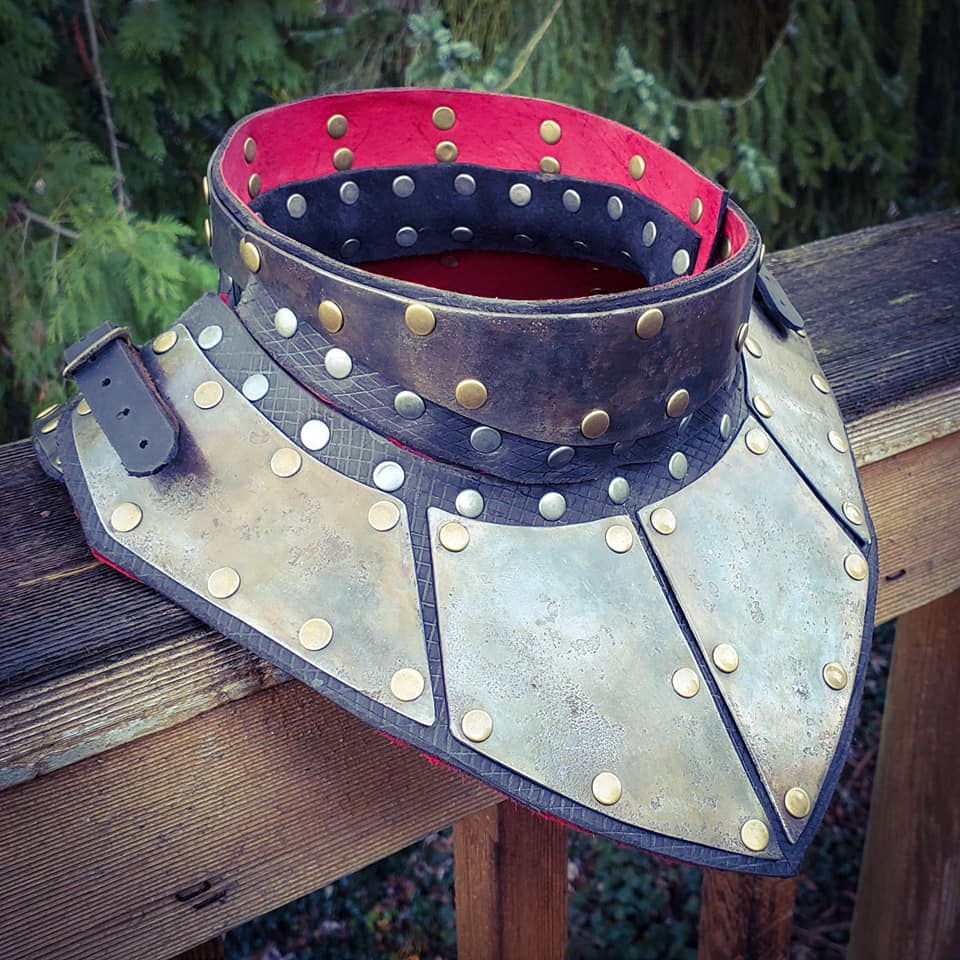 Gorget! The first piece of armor out of my shop. The 16 gauge plates are aged and given a slight case hardening patina. 3 ounce leather with a thin red leather lining and decorative design. I've used this style for longsword and baskethilt steel fighting. This is available for $140 and free shipping in the US. Can be left as is, or I can put straps or tie points for pauldrons.