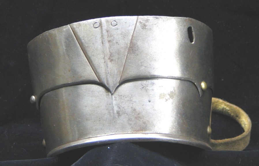 The surface rust apears only on the basket and mostly inside and the basket is of a slightly different color which has led me to surmise that the basket may be of iron while the blade is steel(the blade has more of a graphite color while the basket is more twords brown) . Not having any idea what kind of enviornment this was stored in i'm guessing that most folks over the years who handled it probably did the same thing we do which is put your hand in the basket and grab the handle so the skin brushes around the inside thus creating rust inside and not outside the basket. We've had the same sort of orange rust form on some of the originals we take to faire after a season of letting people handle and examine them. Rust is and the level to which its present is not a gaurantee of age . Just look at the pauldron lames abouve , dating to the last quesrter of the 16th century theres hardly any rust on them except for one "blob"if you will that exists for no apparent reason. The rest of the surface is pretty much flawless(this piece has the features Chris clued us into as well).