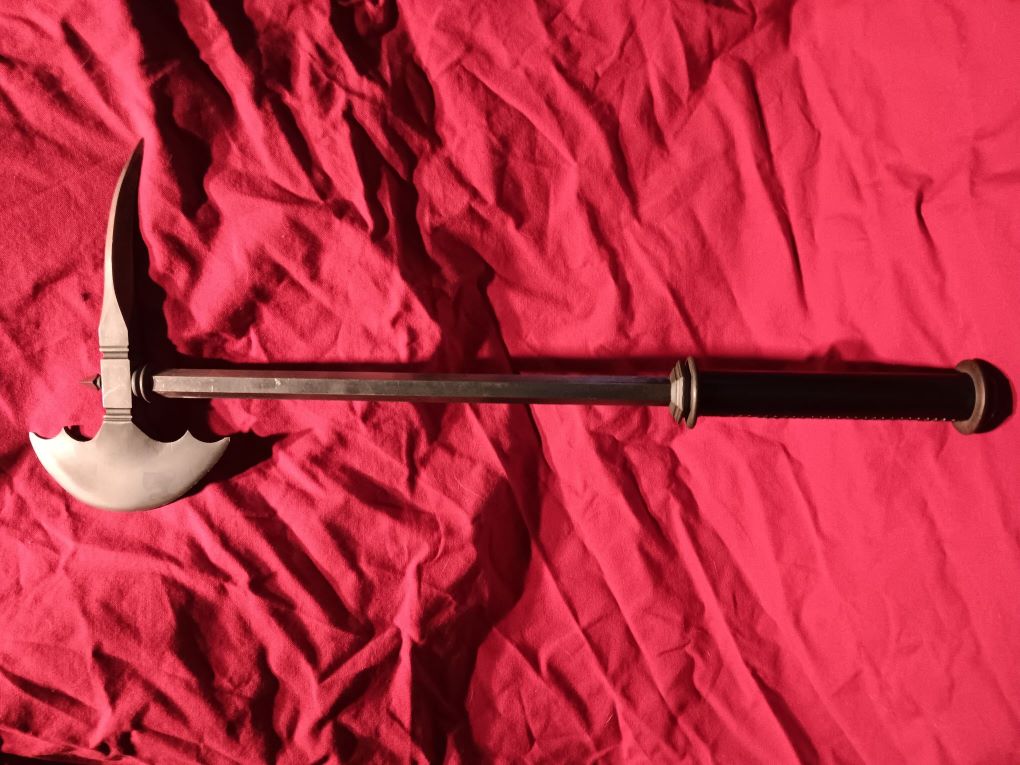 Up for sale is a lovely knightly war axe made by Arms and Armor. This is the older delux version with the much more intricate roundels compared to the version currently available. In my opinion this is the most beautiful late period knightly axe available. 23" overall, 5 1/2" blade, 5" backspike, 3lbs 10oz.