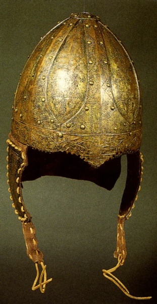 With the collapse of the Western Roman Empire in the early years of the fifth century, the greater part of Europe found itself exposed to a succession of invasions by Goths, Huns, Vandals, Slavs and other warlike tribes, each intent on expanding into, and then holding against their rivals, the territories vacated by the departing imperial legions. The classic headpiece of this period of intense military activity was the so-called Spangenhelm (band-helmet), formed of a mosaic of riveted bands and plates. The popularity of this type of helmet was due not only to the relative ease with which it could be made, but more especially to the fact that, in an age when iron could only be produced in very limited quantities, it could be made of small plates.