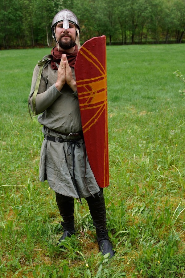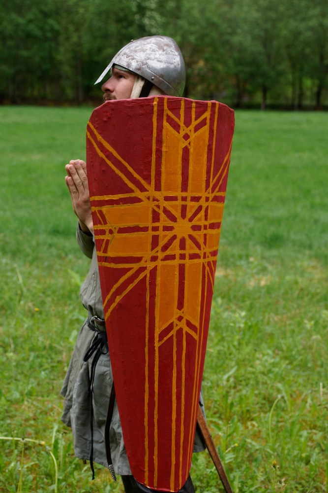Aditionally it features very low attatchment points for the shoulder straps (inspired by the Lewis chessmen) that allows both for more or less free use of the shield while on the straps, and carrying the shield with the shield at eye level witth both hands free.