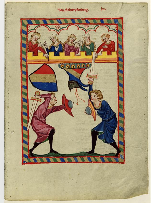 Click through the links on the left side of that page to see amazing details of 13th century German martial culture, including arms, armour, combat, costume, etc. I was particularly taken with the many depictions of what seems to have been a common way to store/display a sword and scabbard (see first image below). Just in case some of you medieval sword enthusiasts were wondering about historically appropriate display.... Attachment: 74.64 KB