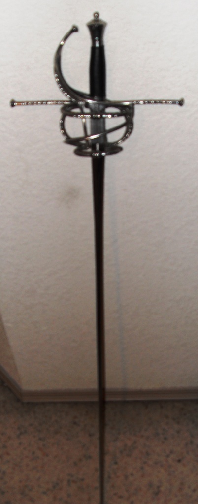 This is the practical musketeer bladed model. Lightly used in fencing class, sword is in good condition. Includes leather scabbard. Button point and unsharpened, good for French and Italian rapier fighting, as well as stage combat. Steel hardware and leather covered hilt. $100 + shipping. Attachment: 74.25 KB