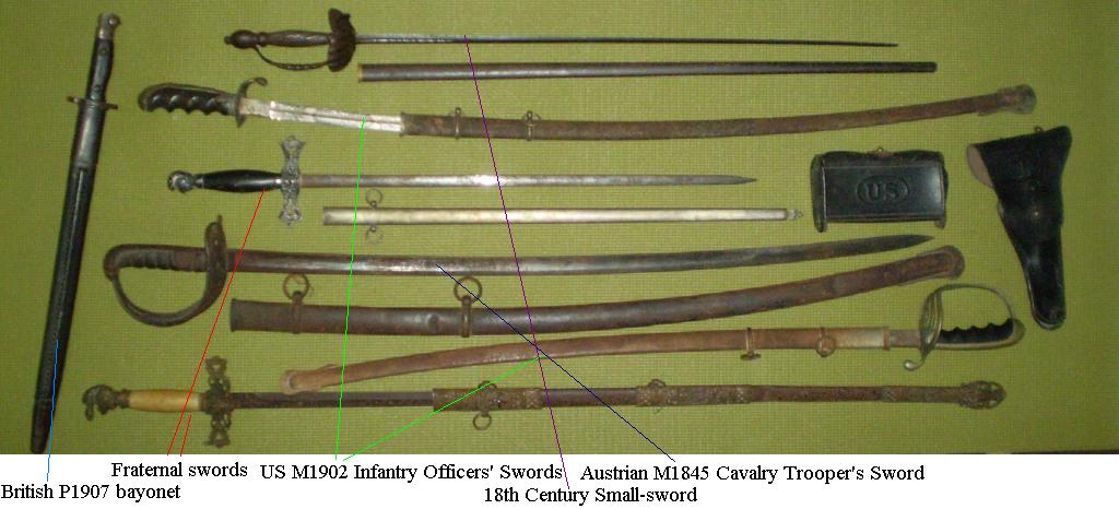 I agree with Markus regarding the small-sword. I think I have managed to ID most of the other swords. The fraternal swords probably have decoration that will help us identify the organizations to which they belong. The bayonet should have markings that will indicate when it was made and by whom, and maybe even the regiment to which it was issued. The M1902s will probably have maker names and may even have the owner's names etched on the blades.