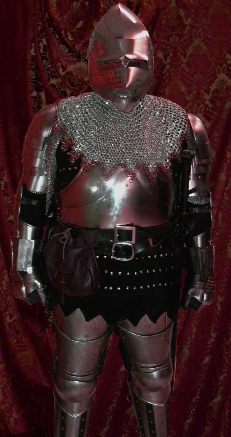 Here is a pic of the breast plate, the helm was by Valentine armoury, the brigantine is Windlass, the mail is from " The Maille Lord " and the full arms and legs from Mercenary Tailor's: The bottom of the BP is sort of hidden by my belts and the top somewhat hidden by the mail aventaile.