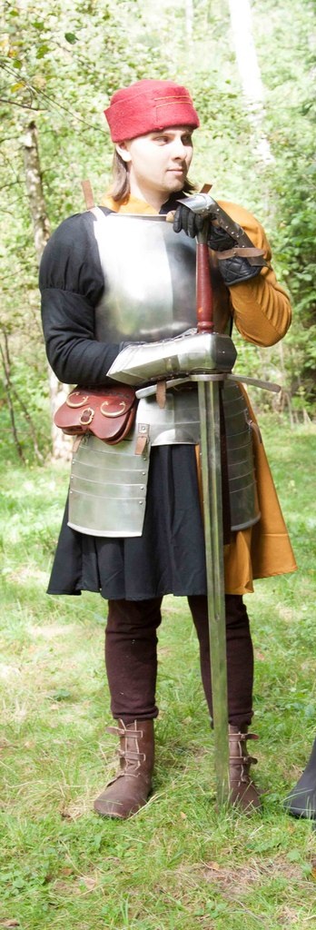 my current armour - based on various 1490-1510 styles - first I wanted to purchase classical high gothic, but then swithched to more round forms of shott-hellingen style. Helmet is kinda fantastic for early 1500's, it is only seen at pictures and only after 1515's this current style came to be, so to be more acurate in dates, I'll buy some Duerer-like sheller for next year.