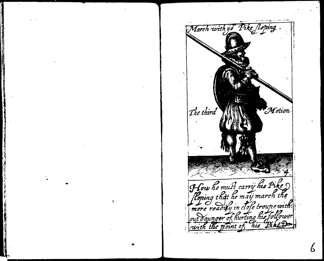 I'm trying to get a feel for how widespread and practical the combination of shield and pike was. I'm interested in any units that used pikes - long infantry spears held in both hands - as well as shields. For the earliest example, historians generally present the ancient Macedonian soldier as wielding sarissa in both hands with a shield strapped to the left arm. This position appears explicitly in Roger Daniel's 1625 translation of Adam Breen's 1618 infantry manual; I've attached four relevant images below. Maurice of Nassau's pikeman carried shields according to Sir Edward Cecil, though it's not clear from his description that they used shield and pike together as in the images. More than half a century earlier, Raimond de Beccarie de Pavie, baron de Fourquevaux, wanted pikeman to carry shields on their backs to sling down to wield alongside their swords when pikes became unusable in the press. Sources on the Battle of Flodden Field 1513 indicate that the mostly pike Scottish force included shields (pavises) but it's not written how they used them. The one woodcut I know of the battle doesn't feature shields.