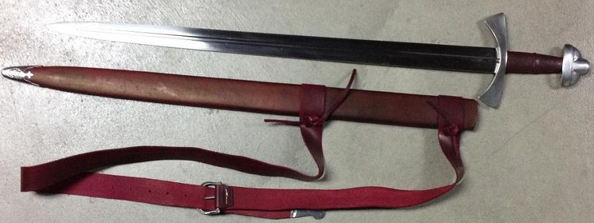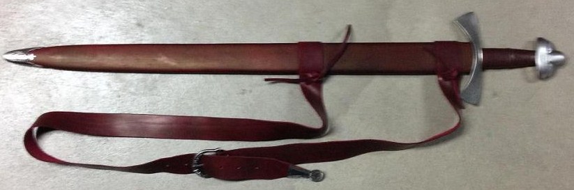 The sword is sharp. The pommel is two parts but the tang has also been peened to the upper pommel as was the historical method with these swords. It features a red baldric with punched and engraved steel fittings.