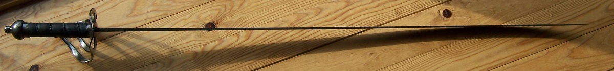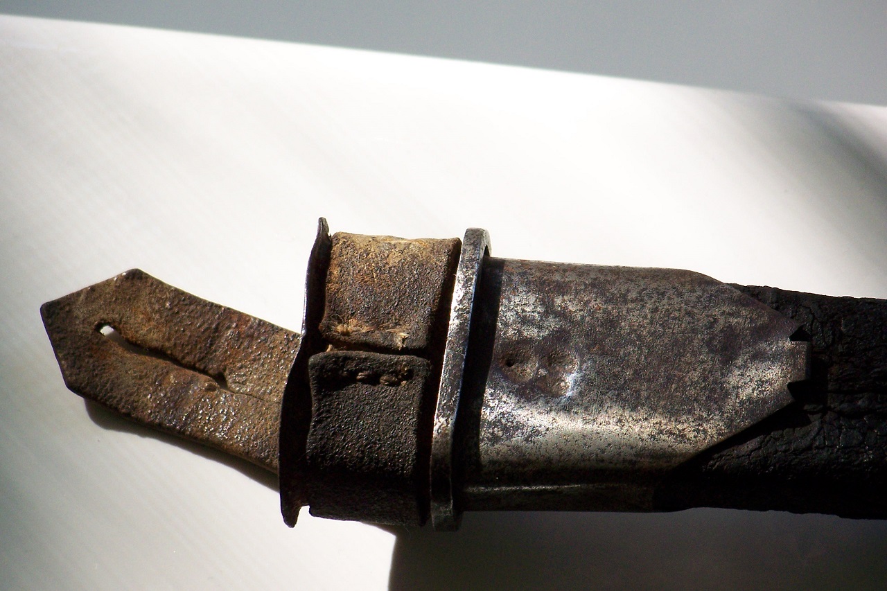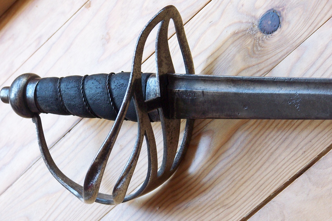 I believe it is a new sword to the collecting world, when I got it the last half of the blade was corroded and uncleaned, only released from its leather scabbard with steel top mount marked by stamping A/57 and the inner hilt is also has a matching mark.