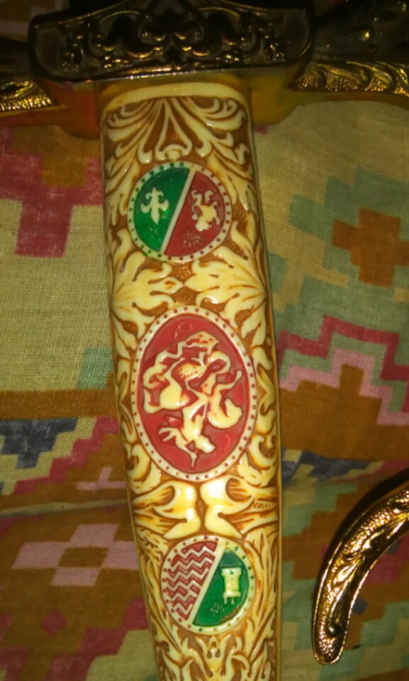 From the pics, it looks like the guard and pommel are cast pot-metal with gold tone. There is no actual detail in all of the bumps and swirls. The original and many of the better replicas show details of figures (cherubs, angels, faces, and human figures?). The grip looks possibly to be plastic. The flatness symmetry of the blade speak to the fact that it is a wall-hanger and not to be handled aggressively.