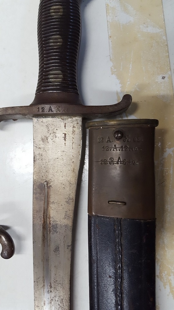 Just a guess, but the A.H. on the scabbard is probably Allgemeines Heeresgerat (<-with an umlaut over the A in heeresgerat. I'm too tired to cut and paste an A with one). I only have a suspicion for the scratched-out RA6. Scabbards and swords for the most part were repurposed again and again (hence multiple scratch outs). The best person to ask about the origins of it is the owner (they probably have a fantastic tale about how it was still on the belt of the dead soldier when they "found it"). They also probably know the battalion/regiment/company they were fighting. Too bad we don't tend to ask intriguing questions as these while the "finder" is alive, but after they've have passed and when we're trying to find some meaningful connection to a major battle or individual that will increase its value. Happy