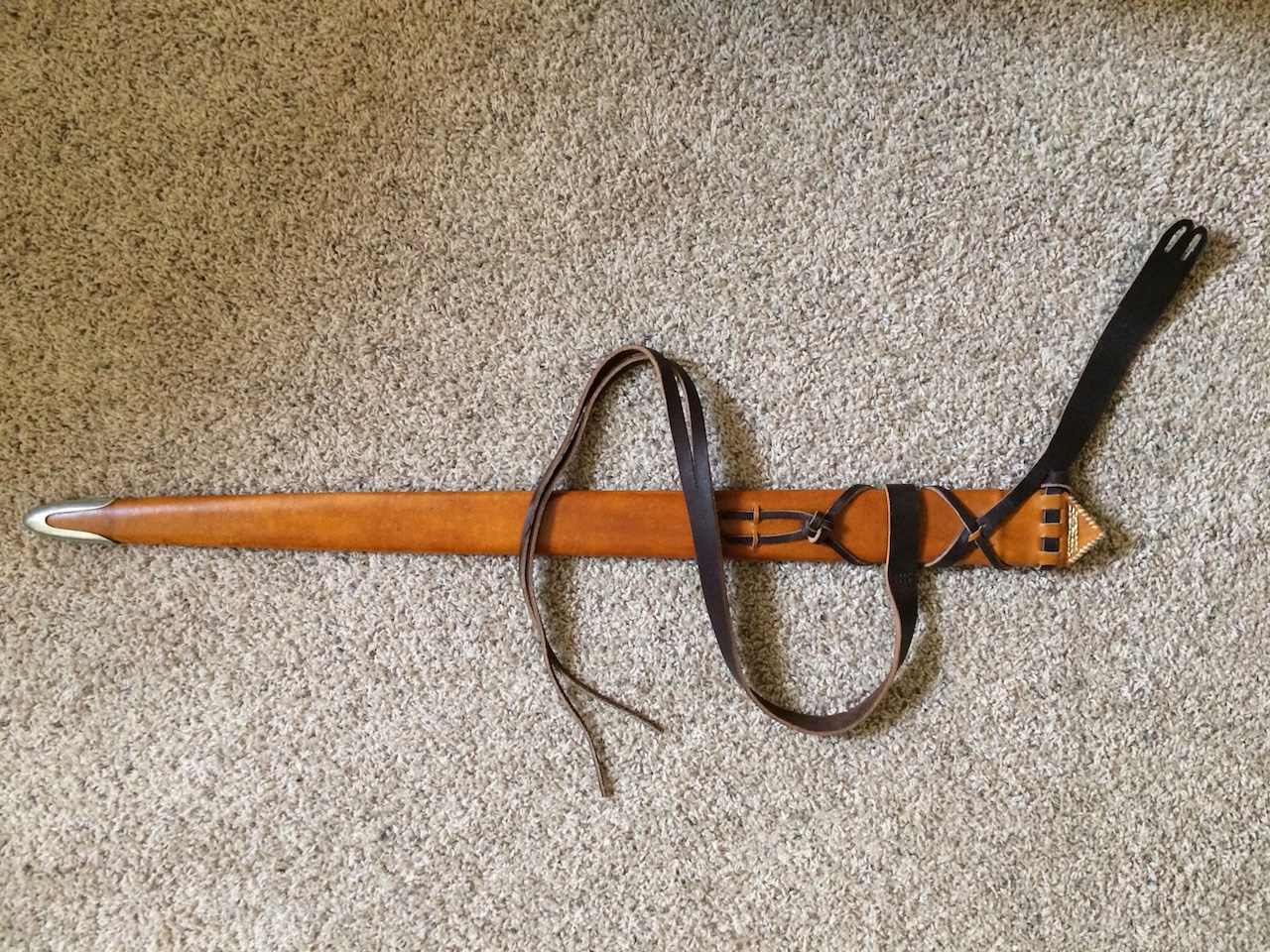 I have a scabbard by Russ Ellis that's a few years old now, made for my Albion Gaddhjalt. I have started making my own scabbards, and have decided to let this one go. It has some slight cosmetic water damage from being worn at events, but is otherwise sound and serviceable. The belt is quite long, and would fit a variety of waist sizes.