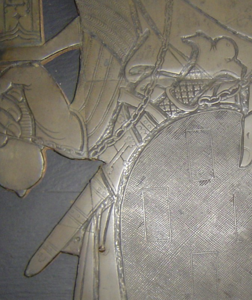 Ralph de Knevynton (+1370), Aveley Curch, Essex, England. No pommel, weapon chain attached to end of tang and this is reportedly a Flemish made brass.