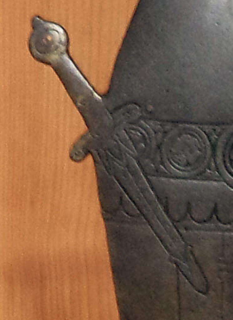 What made me suspicious was that little nib on the top of the handle. It looks like either a ring for a weapons chain or retention for a missing pommel. What kind of pommel would this thing ha have had? I was figuring perhaps an antenna pommel but it seems like the handle would be so heavy the dagger would have trouble hanging point down with a substantial pommel?!?