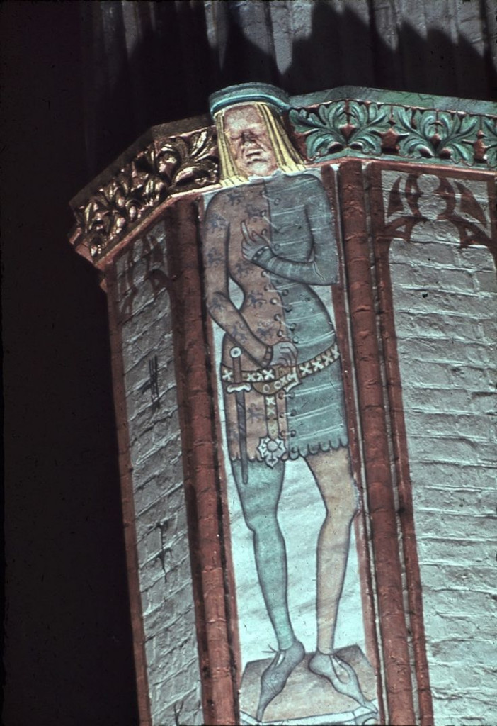 There's a bunch of figures of armed citizens of Stralsund armed with daggers that have some similar features to the daggers I posted painted onto columns in the Sankt Nikolai church (~1370), Stralsund, Mecklenburg-Vorpommern, Germany. Some have handles similar to the one in the Knevynton effigy. One of them has a triangular blade shape similar to the Leiden and Gorinchem daggers, others have different blade shapes including one that could almost be classified as a short sword. That last one looks like the one in the Cray effigy. Others look like some type of Baselard or Anelace hilt. The high degree of variety in 14th century dagger designs is interesting I expected to see nothing but Kidney- and Rondel daggers with a sprinkling of Hollywood standard quillon daggers. I thnk I may actually go for the Willem Wenemaer dagger. It looks like nothing I've ever seen at a 14th century event.